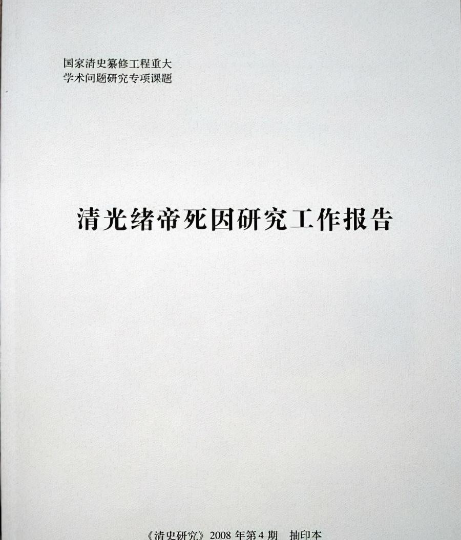 从2003年开始,清史编撰委员会联合央视、清西陵文物管理所、原子能科学研究院以及法医鉴定中心等单位发起了“清光绪帝死因”专题研究项目。通过对清西陵文物管理所珍藏的光绪帝毛发和衣物进行研究,利用“中子活化”、“X射线荧光分析”“原子荧光光度”等先进技术,最后确定光绪帝是被毒死的。